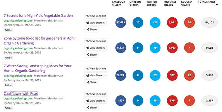 For example, take this post from Organic Gardening, "7 Secrets for a High-Yield Vegetable Garden." According to BuzzSumo, it has six times as many shares as the next most successful article from the same site.